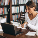 Young woman sitting at the library using books and computer